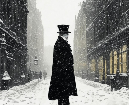 promptline 2025-10-01 00:14:24 2025-10-01 00:14:24 A Victorian man’s top-hatted profile morphs into a snowy London street