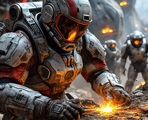 promptline2026-01-28 20:41:192026-01-28 20:41:19A male engineer in a dusty spacesuit urgently welds a breach as alien forces close in