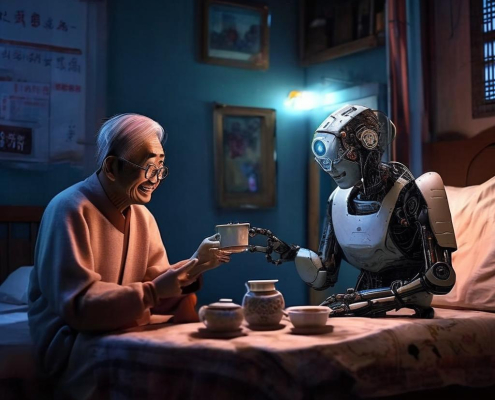 http://promptline.art/wp-content/uploads/2025/11/image_533b1b80-ac33-4601-b55b-ada4a291f921.jpg10241024promptlinehttps://promptline.art/wp-content/uploads/2025/04/logo12-300x138.pngpromptline2025-11-13 05:18:312025-11-13 05:18:31A young Korean robot with a cyberpunk frame shares tea and smiles with an elderly Chinese man in a simple bedroom at night