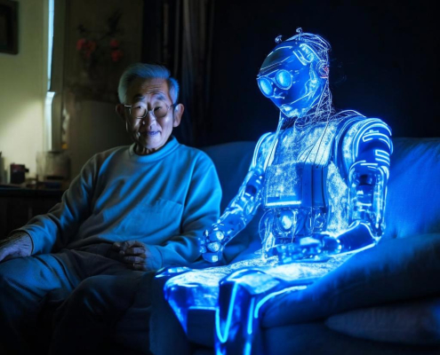 http://promptline.art/wp-content/uploads/2025/11/image_7331ecae-71f6-4cba-abbb-ad41fa9eb4fa.jpg10241024promptlinehttps://promptline.art/wp-content/uploads/2025/04/logo12-300x138.pngpromptline2025-11-12 02:32:232025-11-12 02:32:23A 20-year-old Korean robot with a white cyberpunk body and glowing blue lines shares a sofa with an 80-year-old Chinese man in a simple bedroom at night