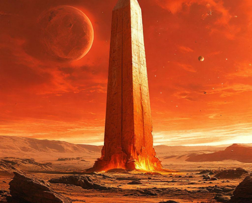 promptline 2025-10-14 12:02:31 2025-10-14 12:02:31 A tall brutalist obelisk with orange neon lights stands on Mars’ orange landscape –ar 9:16 –v 7 –stylize 250