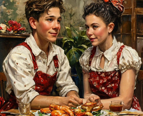 ภาพวาดสไตล์ Norman Rockwell แสดงกุ้งตัวน้อยอาศัยกับเฟอเรตในบ้านน้อย