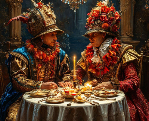 http://promptline.art/wp-content/uploads/2026/01/image_fbvovcm0r37pv7chi8fj.jpg10241024promptlinehttps://promptline.art/wp-content/uploads/2025/04/logo12-300x138.pngpromptline2026-01-08 11:18:392026-01-08 11:18:39Two figures in extravagant costumes sit at a candlelit table