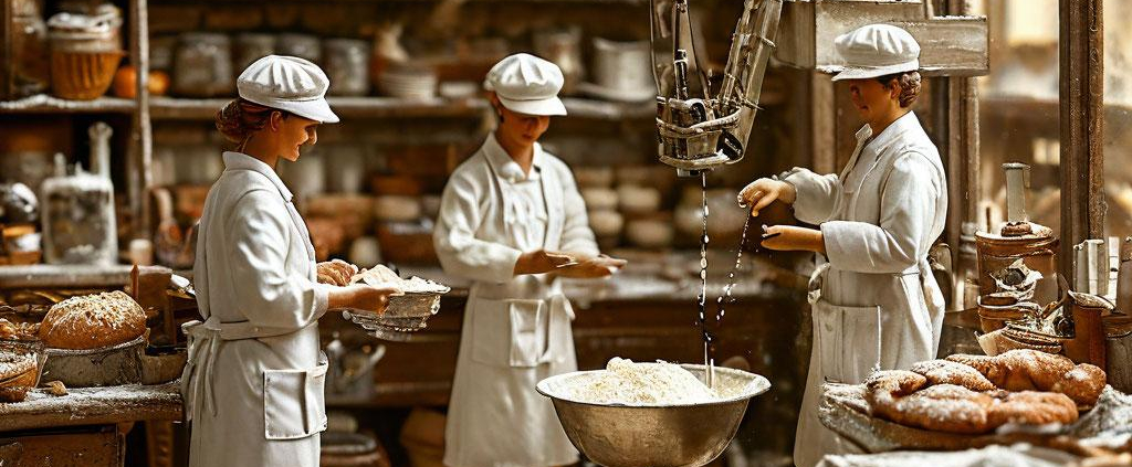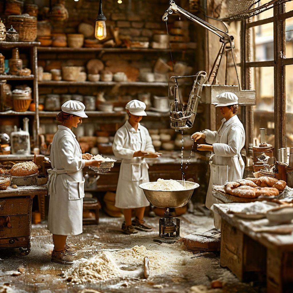 Tiny bakers in white hats guide a miniature crane pouring flour into a bowl