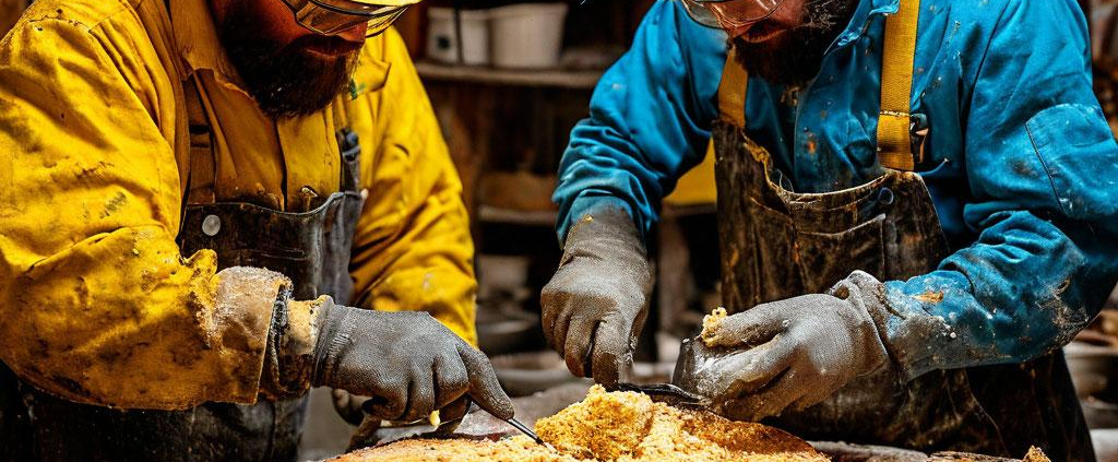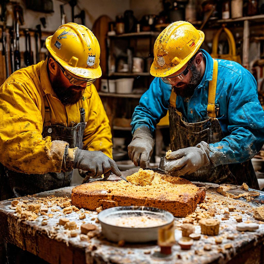 Workers in safety gear meticulously repair a giant rusk on a messy breakfast table